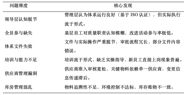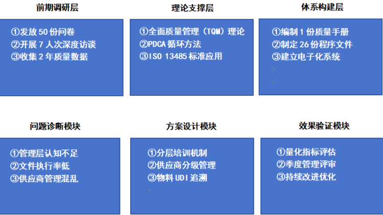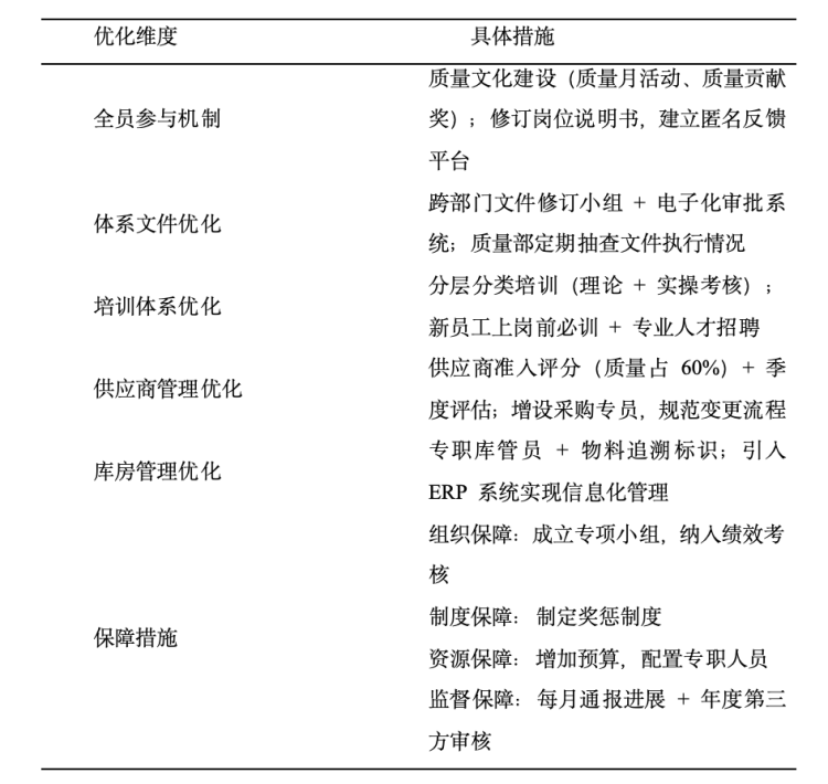 (2)应用创新:针对小型医疗器械企业资源限制,设计“轻量化”解决方案:关键物料备选供应商机制降低单一供货风险,兼职岗位责任矩阵明确跨部门协作流程,通过“质量贡献奖”激发基层员工参与改进。降低成本的同时提升管理效率。