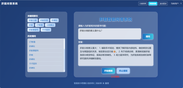 (2)应用创新:系统提供了从数据上传、分割推理、结果可视化到智能分析和问答的一站式服务,极大简化了医学图像分割的操作流程。用户无需具备深厚的编程或AI基础,只需通过Web端简单交互,即可完成高质量的肝脏分割和相关知识获取。智能问答与语音播报功能的结合,不仅提升了用户体验,还为视障人士和临床医生的多场景使用提供了便利。系统的训练与评估流程严格遵循医学标准,支持多种指标的自动计算和历史保存,便于进行模型对比与优化。