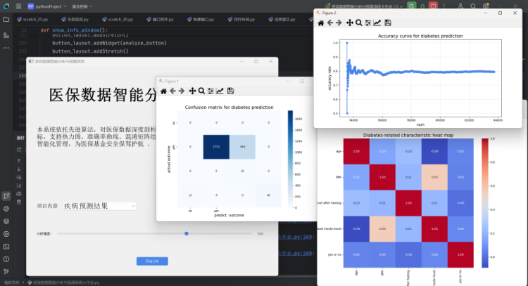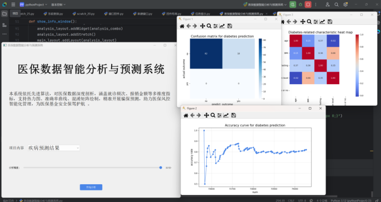 (1)技术创新:本项目构建医保数据智能分析系统,采用多技术协同架构。融合 KNN 模型的简单可解释性与 XGBoost 的高预测精度,分别适配快速初筛与精准分析场景;数据处理环节整合 ETL 工具与分布式存储技术(Hadoop HDFS),实现多源医保数据(结构化费用明细、非结构化病历文本)的清洗、融合与高效存储;交互层面借助 ECharts 搭建交互式可视化界面,支持热力图、折线图等动态展示,并通过参数可调的模型训练模块(如分析精度滑块)优化用户体验,多技术协同提升系统的数据分析深度与操作便捷性。