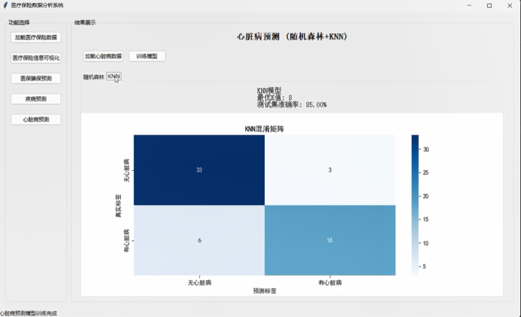 本项目设计并实现了医保监管与疾病预测深度融合的智能分析系统。医保智监端基于KNN算法开发骗保行为实时识别模块,输出混淆矩阵与动态ACC曲线实现基金风险预警;疾病预诊端集成KNN与随机森林双模型,支持心脏病风险分层评估并输出特征重要性排序;创新融合UCI心脏病数据集与本地医保数据,开发就诊次数直方图、支付对比线型图、费用占比柱状图及就诊-支付散点图四维动态。采用Tkinter构建全流程交互平台,实现数据加载、可视化、模型训练、结果对比。