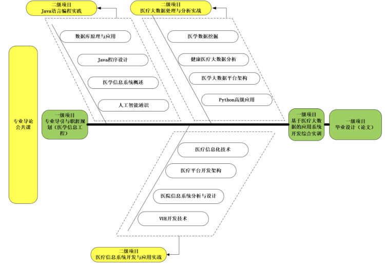 (2)专业基础课与专业课:C语言程序设计、操作系统基础、医学电子学基础、数据库原理与应用、基础医学、临床医学概论、信号与系统、医学传感技术及应用、单片机技术与应用、医学信息分析与处理、Java语言程序设计、计算机网络技术、Python高级应用、医疗信息化技术、医学信息系统、医疗平台开发架构、医学数据挖掘、深度学习、医学大数据平台架构、医学图像处理、大数据可视化、Oracle数据库管理与开发、健康医疗大数据分析、医学自然语言处理、移动医疗开发、C#程序设计、医疗知识图谱、VUE开发技术等。