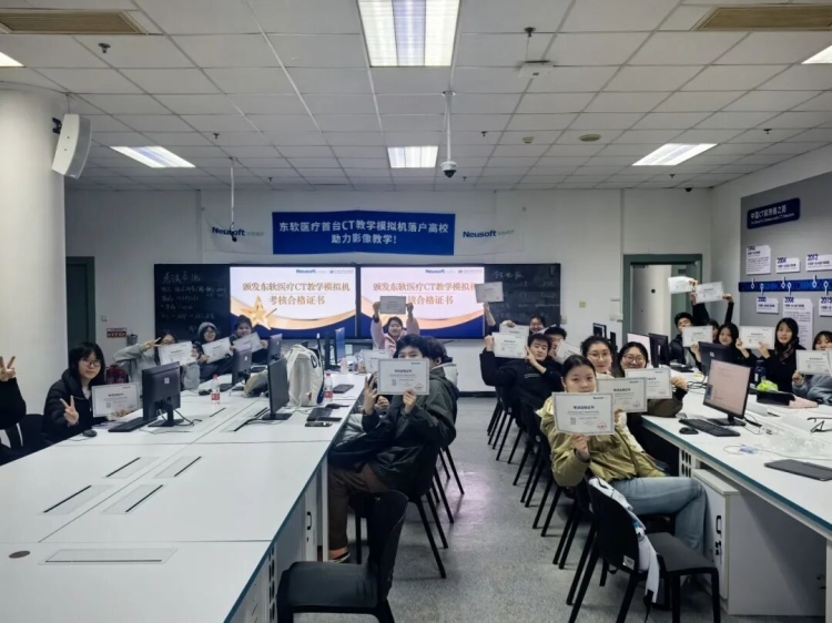 1月7日,健康医疗科技学院与沈阳东软医疗系统有限公司(以下简称“东软医疗”)联合举办的课内外一体化培训结课仪式在A2-128医学影像技术模拟CT实验室举行,为本学期参与培训并考核合格的学生颁发校企联合认证证书。该证书既是对学生能力的高度认可,也是实习推荐与就业选拔的重要依据,有效打通了校园到职场的“最后一公里”。