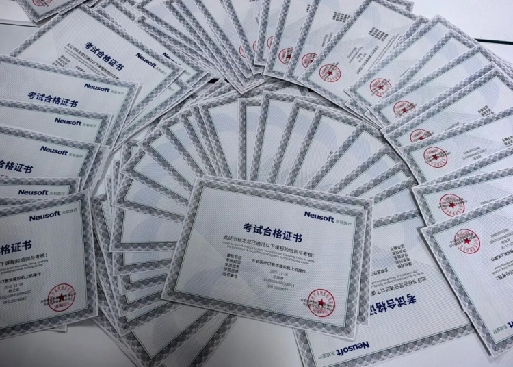 培训结业后,双方联合开展设备操作、图像质量评价、后处理能力等全方位测评,合格学生获东软医疗认证证书。健康医疗科技学院党委书记骆磊、东软医疗服务销售部经理贾彦向学生颁发证书并分表发言。