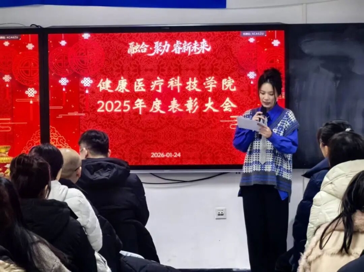 以成长绘就底色,以团队凝聚力量,以深耕续写华章。2026年1月24日,健康医疗科技学院于A2-128实验室召开2025年度总结暨表彰大会。学院院长宋文斌、党委书记骆磊、副院长王帅、姜羲、孙风栋及全体教师齐聚一堂,共同回顾“恒进”之年的奋斗历程,擘画“深耕”之年的发展蓝图。大会由健康服务与管理系副主任王坤晓主持。